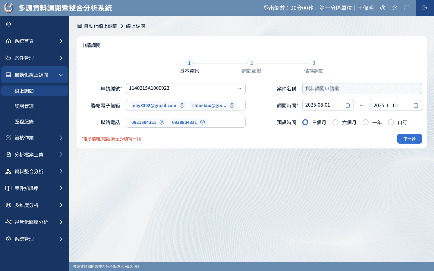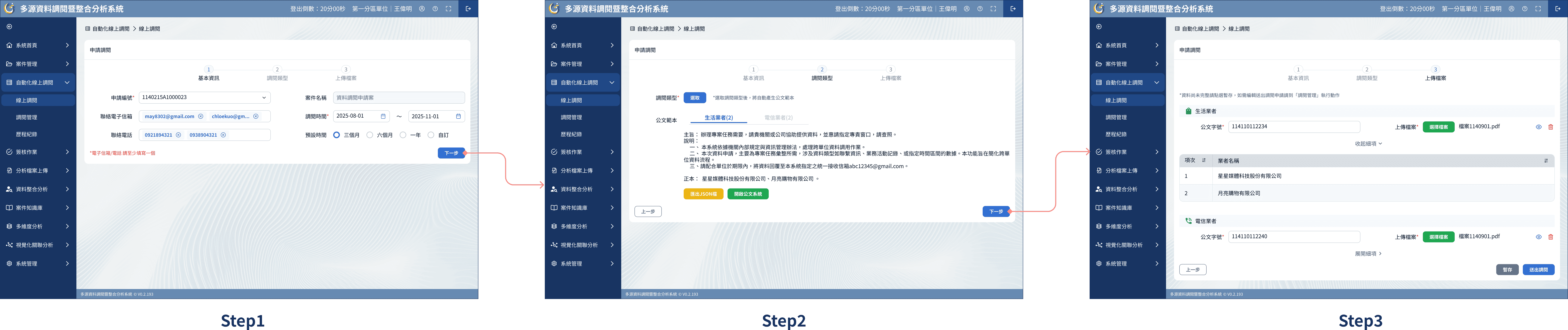 此功能是讓資料調閱的流程從人工操作轉為自動化執行。使用者只需在系統中輸入基本申請資料並送出,系統即會自動依規則派送申請至各資料來源,完成調閱、回傳與歸檔並自動通知。使用者可以直接查看申請進度,並減少人工等待與重複作業。