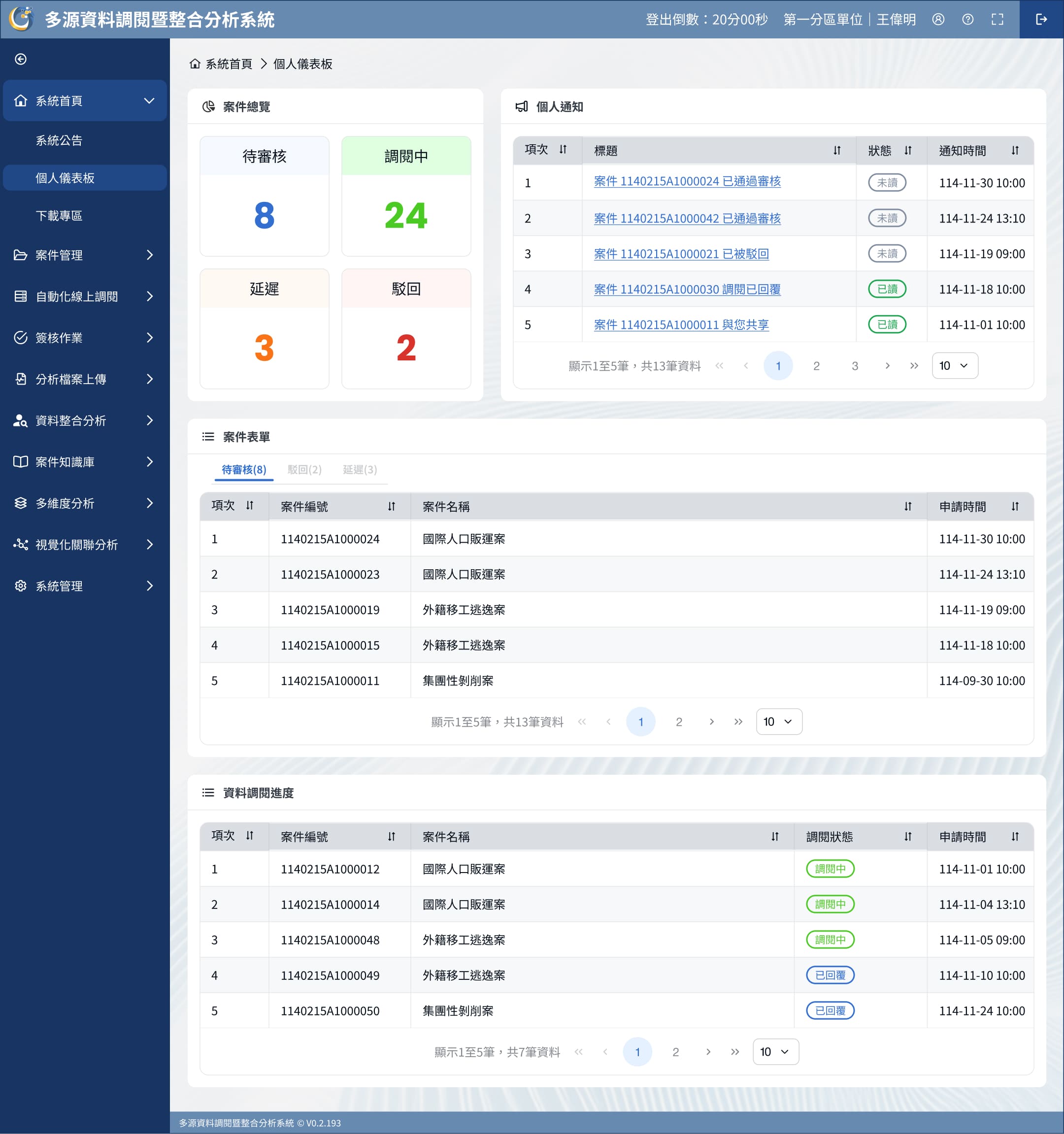 個人儀錶板:登入後快速掌握案件狀態與作業整體進度。