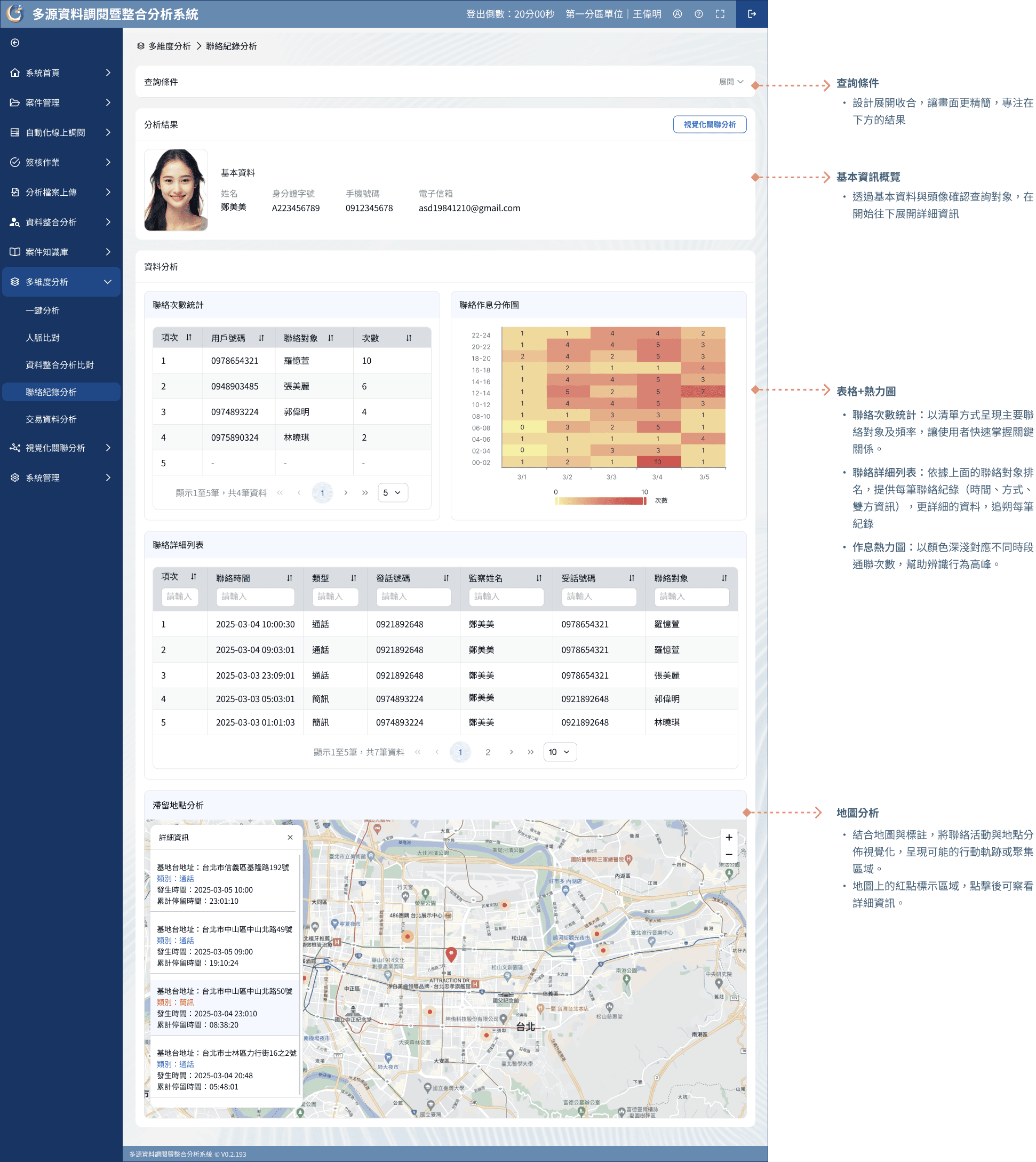 在多維度分析中,使用者可針對查詢對象進行多角度的資料比對與行為分析。系統整合不同來源的資料,透過圖表視覺化的方式,協助使用者快速掌握關聯對象、活動時段與空間分佈,以更直觀的方式呈現資訊間的潛在關聯與行為模式。
