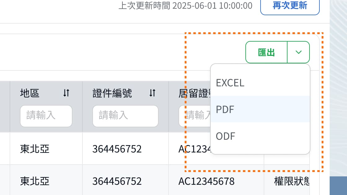 .右側結果列表:為了方便資料篩選,每個欄位標題下方提供快速篩選欄位,使用者可在同一畫面中直接篩選,避免頁面跳轉與操作。右上方的「匯出」功能整合於單一按鈕中,點擊後下拉式選單選擇不同匯出格式(PDF、Excel 等),以減少按鈕數量並保持介面整潔。