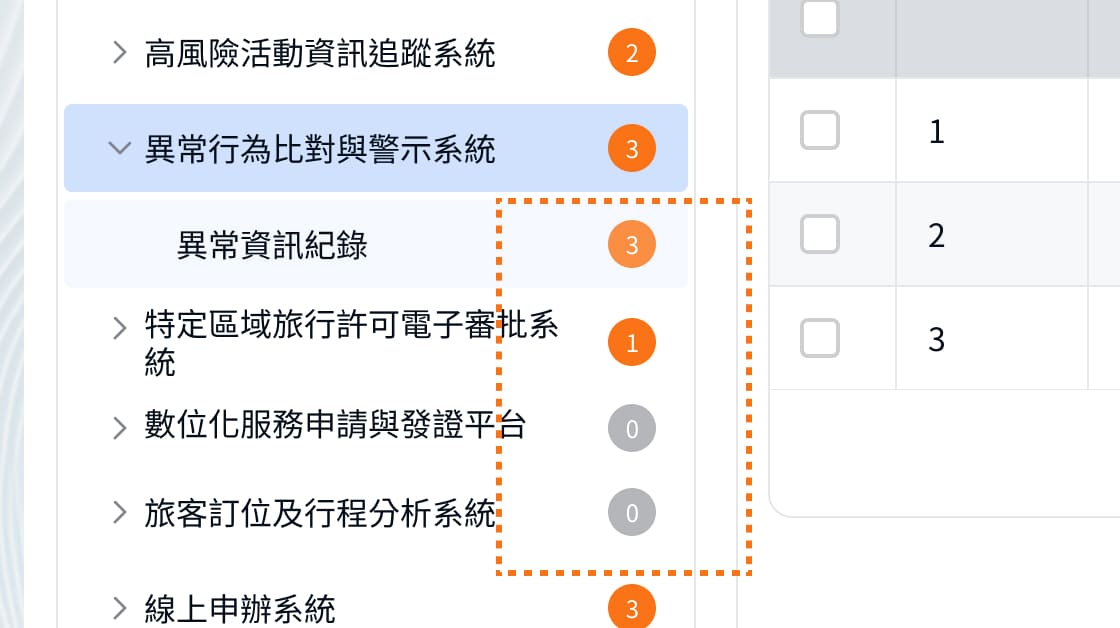 .左側資料來源:系統清單的右側橘色數字圓圈代表查詢結果數量,無結果則以灰底顯示,讓使用者能即時了解哪些系統有資料回傳,不需要一個個開啟檢視,顏色的區隔也可以快速理解。